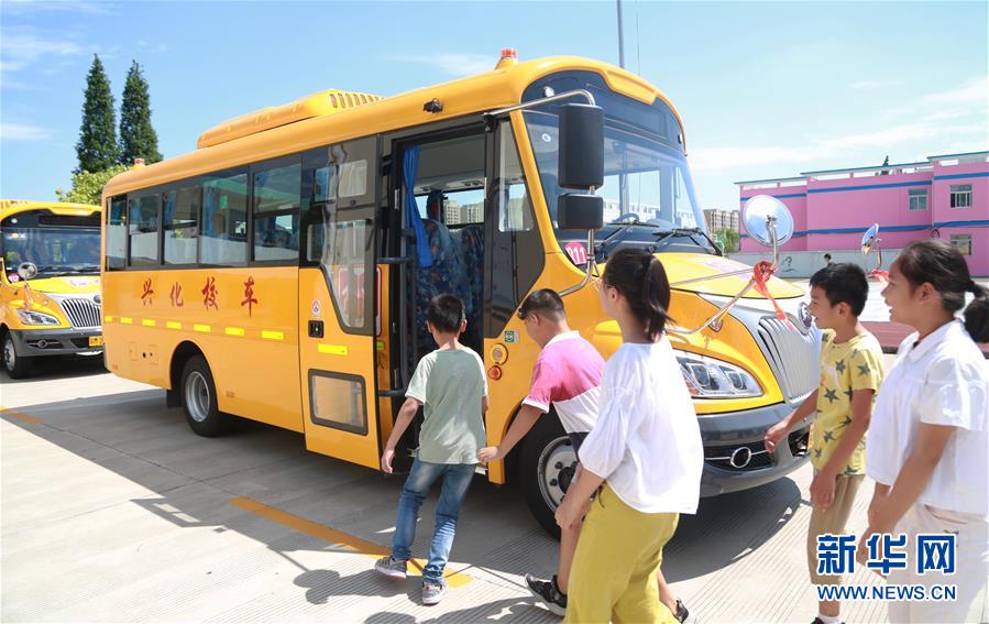 8月23日,兴化市临城中心校学生参观体验即将投入使用的新校车。