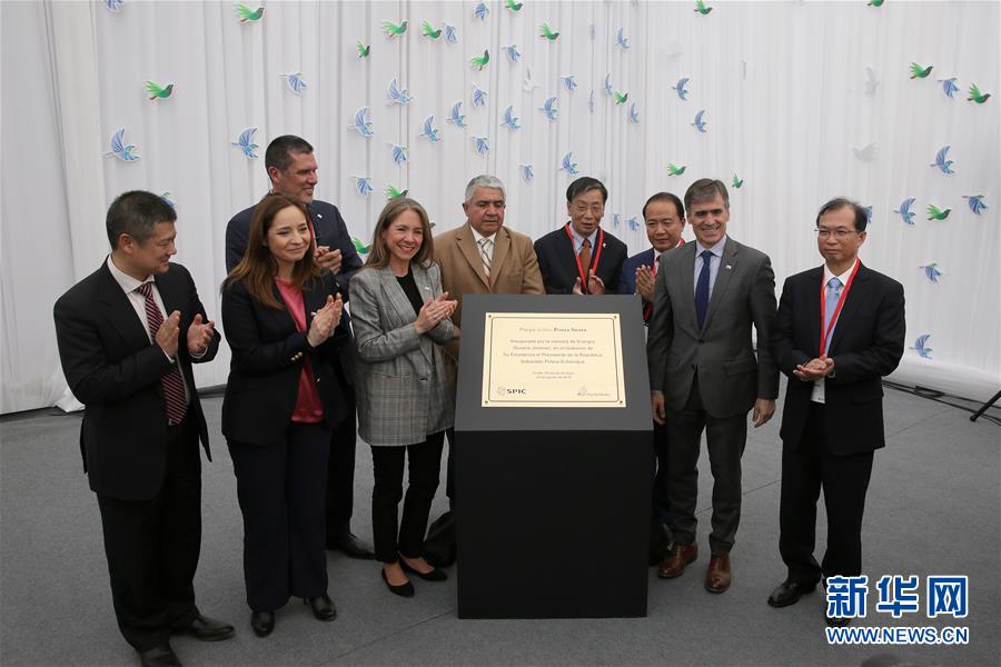 8月24日,在智利北部奥瓦耶市远郊,智利经济部长巴伦特(右二)等嘉宾为蓬塔谢拉风电场揭幕。 中国在智利投资建设的首个风电场——蓬塔谢拉风电场24日正式投产发电。该风电场位于智利北部奥瓦耶市远郊,距离首都圣地亚哥320公里。蓬塔谢拉风电场是中国国家电投积极响应“一带一路”倡议的项目。项目总装机容量80兆瓦,总投资额近1.5亿美元,预计年均发电量为282吉瓦时,可满足13万户家庭的用电需求,同时每年还能减少15.7万吨碳排放。 新华社记者王沛摄