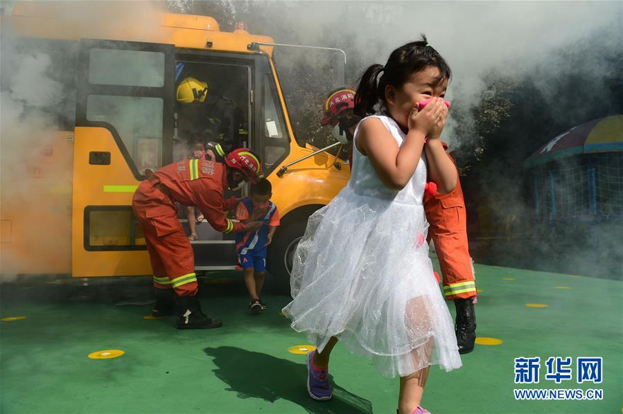 8月27日,沧州市公安消防支队新华区建设大街中队的消防战士指导幼儿园的孩子从“着火”的校车中紧急疏散。 新学期开学在即,河北省沧州市新华区在幼儿园、中小学举行消防应急逃生演练,重点针对校车安全、突发火情逃生等环节进行模拟演练,提高学生的防范意识与应急避险能力。 新华社发(傅新春 摄)