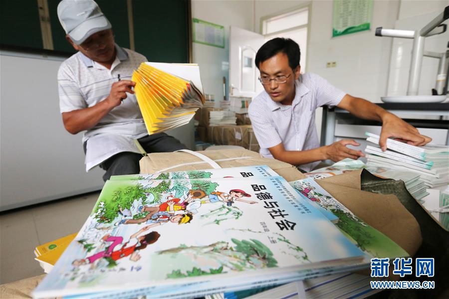 8月28日,山东省临沂市郯城县郯城街道归义小学的老师正在整理登记新教材。新华社发(张春雷 摄)