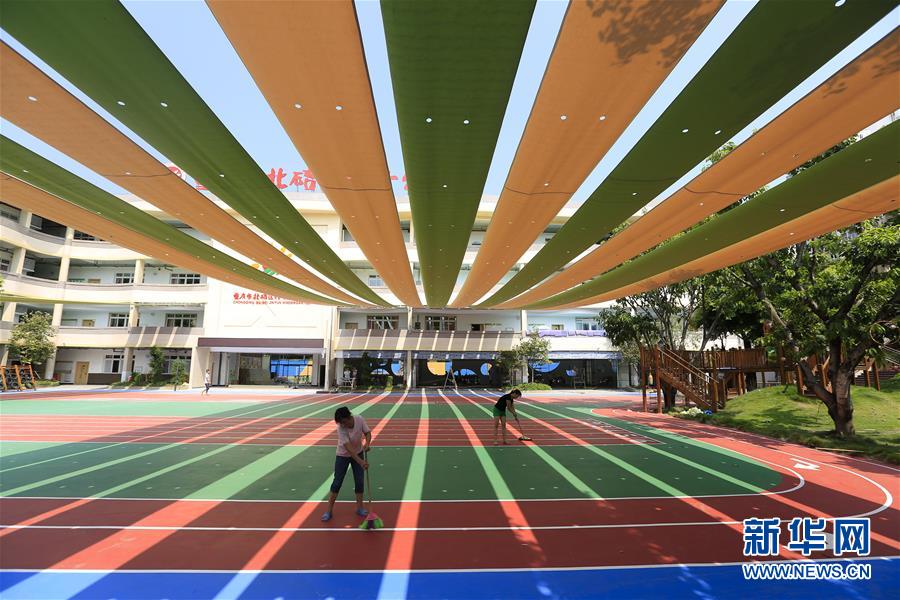 重庆市北碚区缙云幼儿园利用假期把校园装扮一新,新建成的彩色遮阳棚让孩子们在高温下有了更多户外活动空间,老师们动手制作饰品装扮教室,以崭新的面貌迎接新学期到来。