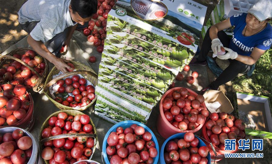 8月28日,陕西省渭南市华州区金堆镇东西坪村村民在包装准备外销的高山水果西红柿。 地处秦岭深处的陕西省渭南市华州区金堆镇在推进脱贫攻坚的过程中,按照“一村一品”的产业扶贫模式,通过兴建扶贫基地、发展高山水果西红柿等特色农产品种植,搭建劳动力就业及农产品电商销售平台,初步形成了“镇有平台,村有特色,户有产业”的扶贫格局,所产的高山西红柿等农产品俏销各地,成为山区居民脱贫致富的“金蛋蛋”。 新华社记者 陶明 摄