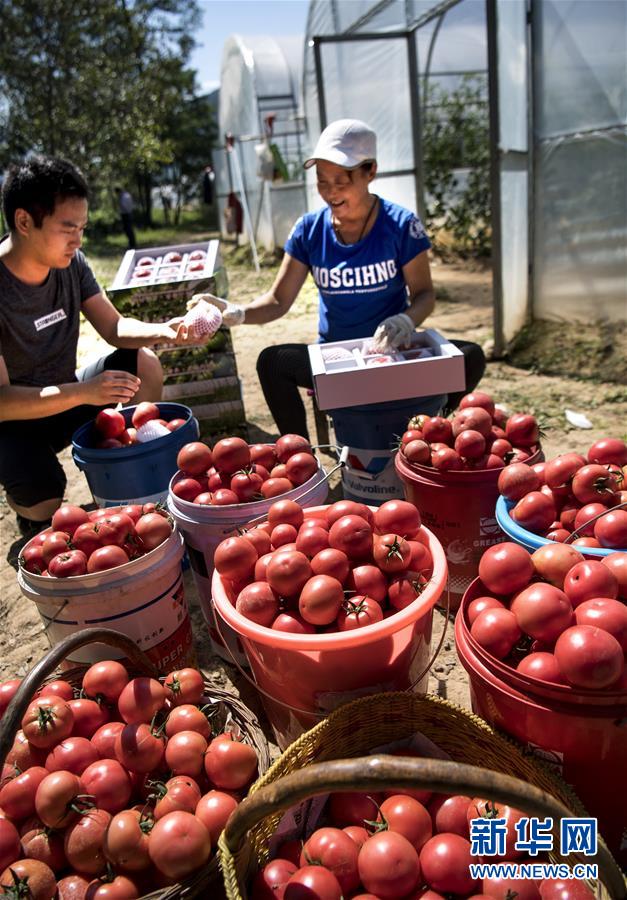 8月28日,陕西省渭南市华州区金堆镇东西坪村村民在包装准备外销的高山水果西红柿。 地处秦岭深处的陕西省渭南市华州区金堆镇在推进脱贫攻坚的过程中,按照“一村一品”的产业扶贫模式,通过兴建扶贫基地、发展高山水果西红柿等特色农产品种植,搭建劳动力就业及农产品电商销售平台,初步形成了“镇有平台,村有特色,户有产业”的扶贫格局,所产的高山西红柿等农产品俏销各地,成为山区居民脱贫致富的“金蛋蛋”。 新华社记者 陶明 摄
