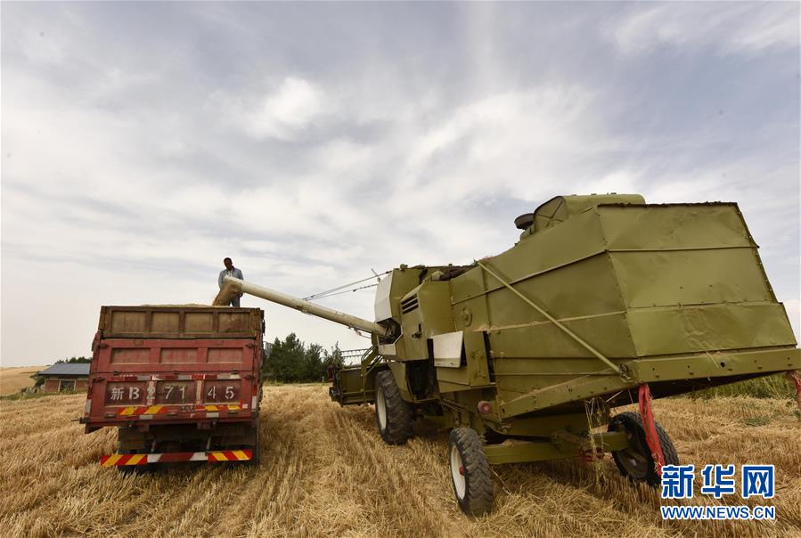 在新疆奇台县江布拉克景区,当地农民使用联合收割机收割小麦(8月27日摄)。 新华社记者 赵戈 摄