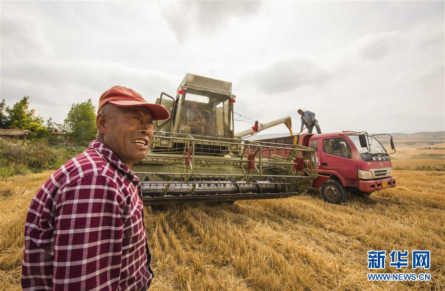 在新疆奇台县江布拉克景区,农民史生奇(左)在自家小麦地里观察联合收割机收割情况(8月27日摄)。 新华社记者 赵戈 摄