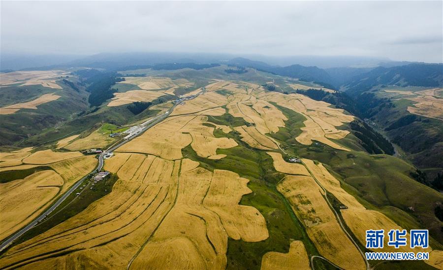 空中俯瞰新疆奇台县江布拉克景区内成熟的旱地小麦(8月27日无人机拍摄)。 新华社记者 赵戈 摄