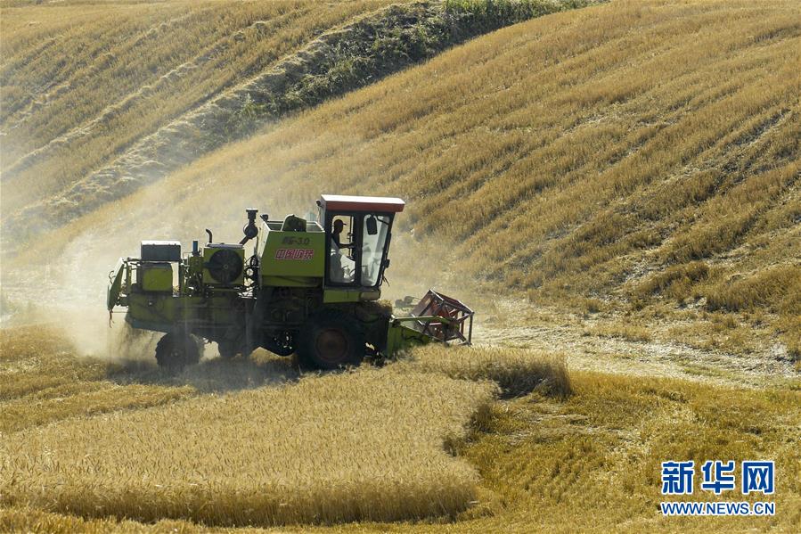 在新疆木垒哈萨克自治县天山木垒中国农业公园里,当地农民在收割小麦(8月26日摄)。 新华社记者 赵戈 摄