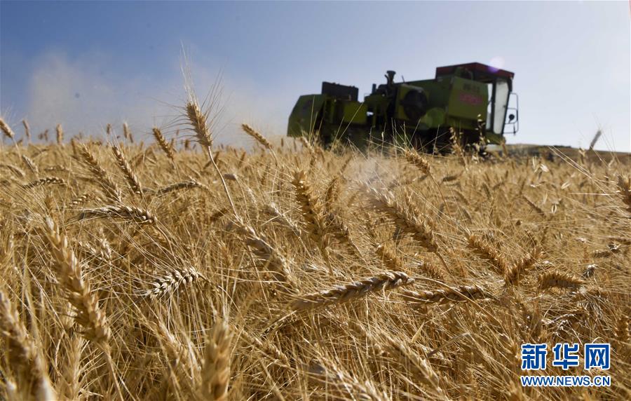 在新疆木垒哈萨克自治县天山木垒中国农业公园里,当地农民使用联合收割机收割小麦(8月26日摄)。 新华社记者 赵戈 摄