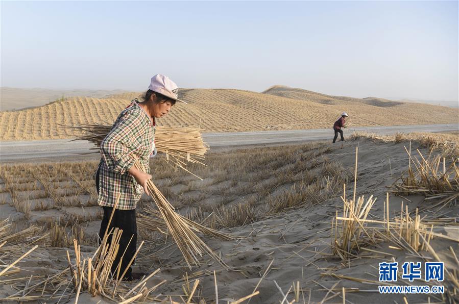 在新疆尉犁县至且末县沙漠公路的施工现场,48岁的徐思芳(左)在修建芦苇草方格(7月10日摄)。