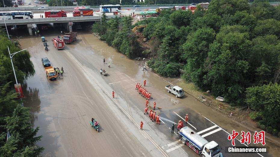 扬州消防官兵在寿光市纪台镇寿尧路高速桥下道路清淤。孟德龙 摄