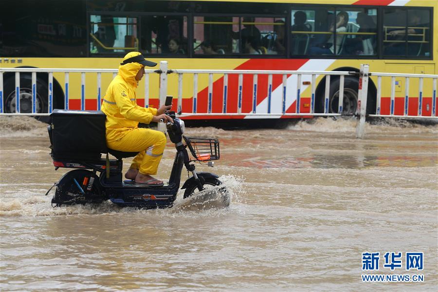 8月29日,一名外卖送餐员在厦门市思明区湖滨东路涉水骑行。
