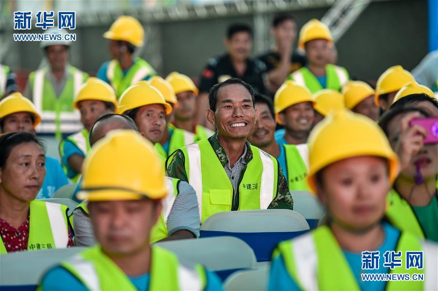 8月29日,项目工友在深圳南方科技大学校园建设工程(二期)项目工地上观看文艺演出。 当日,安全、环境知识竞赛暨安全文艺汇演在深圳南方科技大学校园建设工程(二期)项目工地举行,活动以安全环保为主题,通过知识竞赛和音乐短剧、小品、相声等文艺演出形式,宣传强化安全、绿色理念。 新华社记者 毛思倩 摄