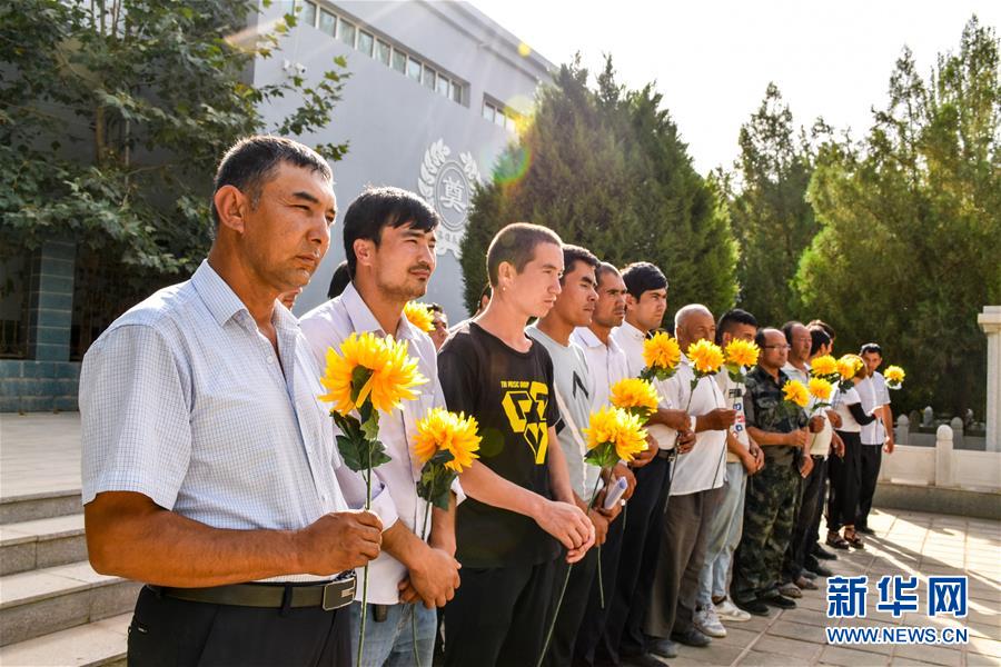 艾买尔·依提的儿子艾尼瓦尔·艾买尔(左一)和当地村民向烈士们献花(8月15日摄)。 新华社记者 段敏夫摄