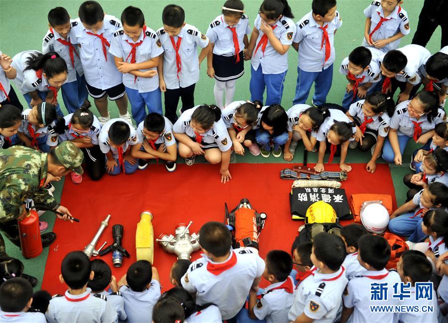 8月30日,在承德市避暑山庄小学,消防战士为学生讲解消防器材使用方法。 当日,河北省承德市双桥区消防大队与承德市避暑山庄小学联合开展消防安全教育“开学第一课”。学生们在消防官兵的指导下,体验使用消防器材,参加消防逃生演练,提升消防安全意识和自救能力。 新华社记者 王晓 摄