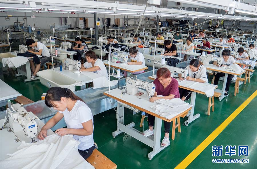 8月30日,村民在武邑县武邑镇韩王思公村“扶贫微工厂”内加工服装。 近年来,河北省武邑县在推进脱贫攻坚中,鼓励当地一些劳动密集型、手工加工型企业进驻农村开设“扶贫微工厂”,带动有劳动能力的贫困群众在家门口实现就业。目前,武邑县已在62个贫困村建立“扶贫微工厂”近百个,吸纳近5000名村民就业。 新华社记者 朱旭东摄