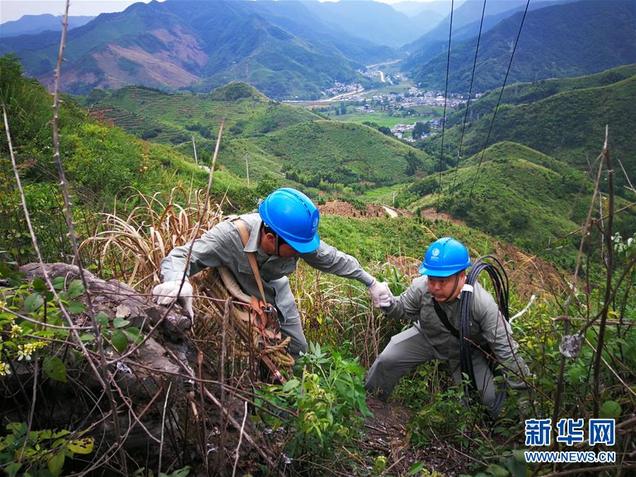 两名“跑山电工”在巡线路上(7月24日摄)。