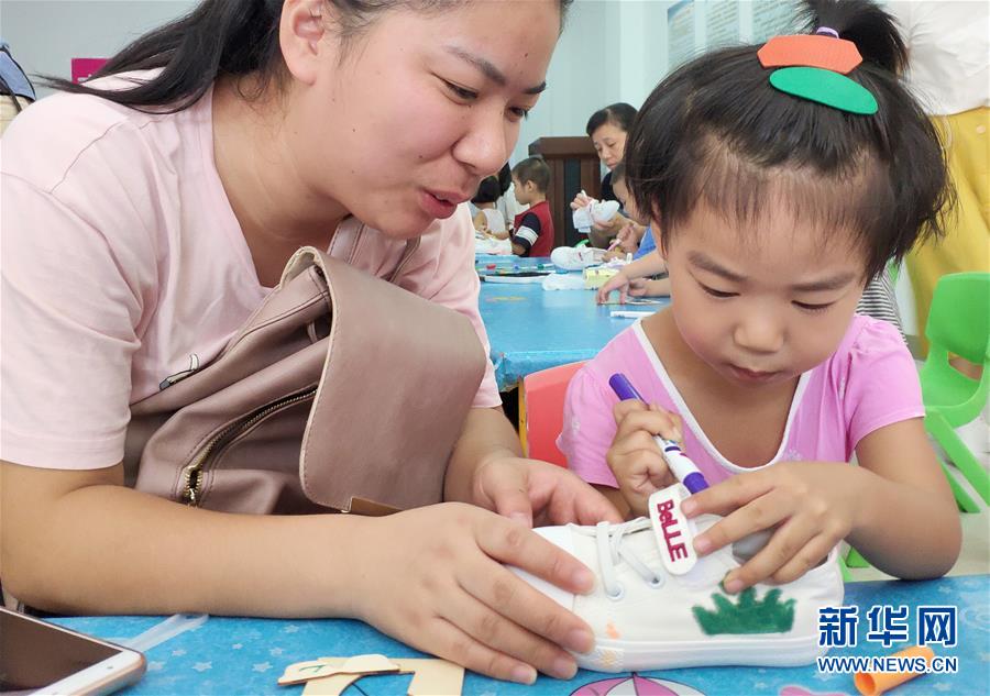 8月31日,在安徽省合肥市包河区方兴社区,孩子在家长的带领下给小白鞋涂鸦。