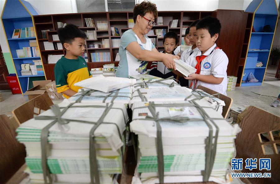 8月31日,河北省邯郸市赵王小学老师为学生们发放新课本。 当日是河北省邯郸市各小学返校报到的日子,同学们回到学校领取新课本,迎接开学。 新华社发(郝群英 摄)