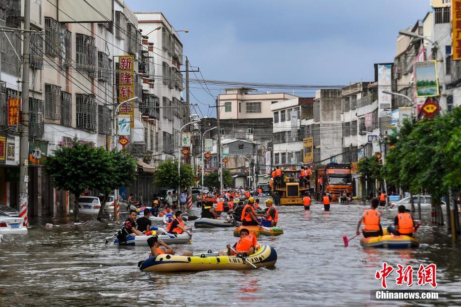 9月2日,广东汕头市潮阳区华丽社区,救援人员使用皮划艇运输被困民众。连日来,广东汕头潮阳区持续强降水引发严重灾情,全区13个镇(街道)多地出现内涝和水浸,全区受灾村(社区)229个,受灾人口39.4674万人。截至记者发稿时,政府相关部门与民间组织仍在灾区抗洪救灾,安全转移民众58962人。中新社记者 陈骥旻 摄