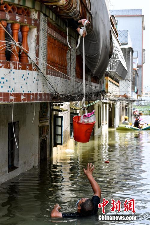 9月2日,广东汕头市潮阳区树香村,一名村民用水桶接过救援人员提供的食物。连日来,广东汕头潮阳区持续强降水引发严重灾情,全区13个镇(街道)多地出现内涝和水浸,全区受灾村(社区)229个,受灾人口39.4674万人。截至记者发稿时,政府相关部门与民间组织仍在灾区抗洪救灾,安全转移民众58962人。中新社记者 陈骥旻 摄