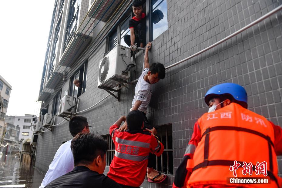 9月2日,广东汕头市潮阳区华丽社区,救援人员救助两名被困民众。中新社记者 陈骥旻 摄