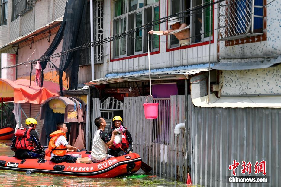 9月2日,广东汕头市潮阳区树香村,救援人员为民众提供食物。连日来,广东汕头潮阳区持续强降水引发严重灾情,全区13个镇(街道)多地出现内涝和水浸,全区受灾村(社区)229个,受灾人口39.4674万人。截至记者发稿时,政府相关部门与民间组织仍在灾区抗洪救灾,安全转移民众58962人。中新社记者 陈骥旻 摄