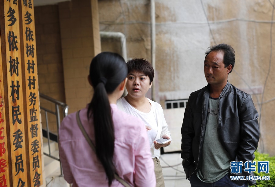 8月30日,阿里巴巴脱贫基金女性公益保险项目负责人王菁(中)在元阳县新街镇多依树村与当地扶贫干部沟通。