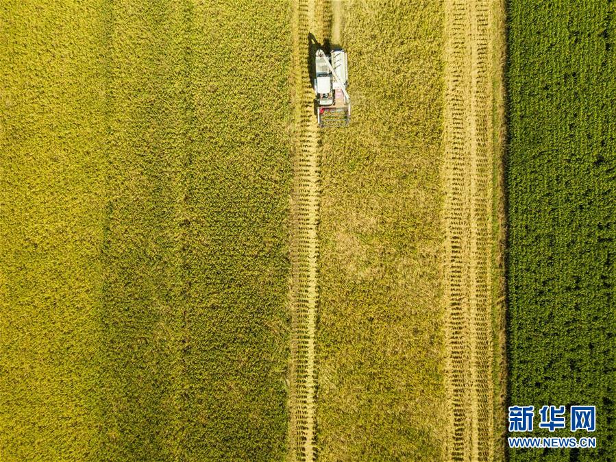9月3日,湖北省襄阳市保康县马桥镇中坪村农民驾驶收割机在田间收割水稻(无人机航拍)。近日,湖北省襄阳市保康县水稻开镰收割,田间地头到处是繁忙的丰收景象。新华社发 杨韬 摄