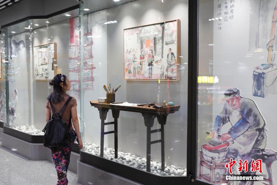 9月3日,市民在在上海地铁陕西南路站文化长廊内欣赏石库门前的市井生活。近日,在上海地铁陕西南路站文化长廊开幕的 “上海屋檐下——汪大文作品展”,让往来乘客们在水墨丹青中重温改革开放初期的上海里弄风情,感悟时代辉煌成就。中新社记者 殷立勤 摄