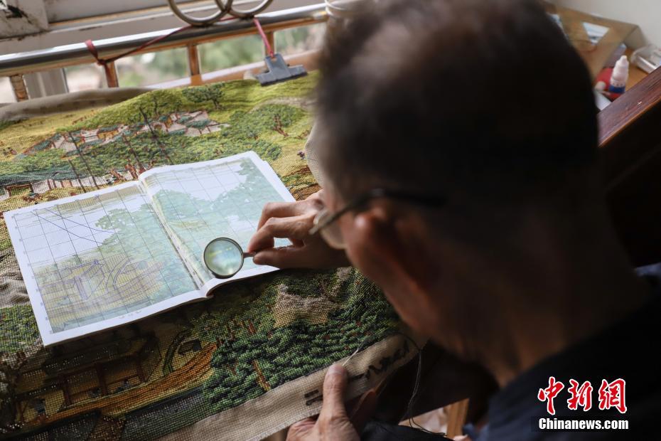 9月4日,黄肇柏对照说明书查看作品。贵州省清镇市86岁老人黄肇柏用300余天、每天花费10余小时绣制完一幅3米长的《清明上河图》十字绣作品。中新社记者 瞿宏伦 摄