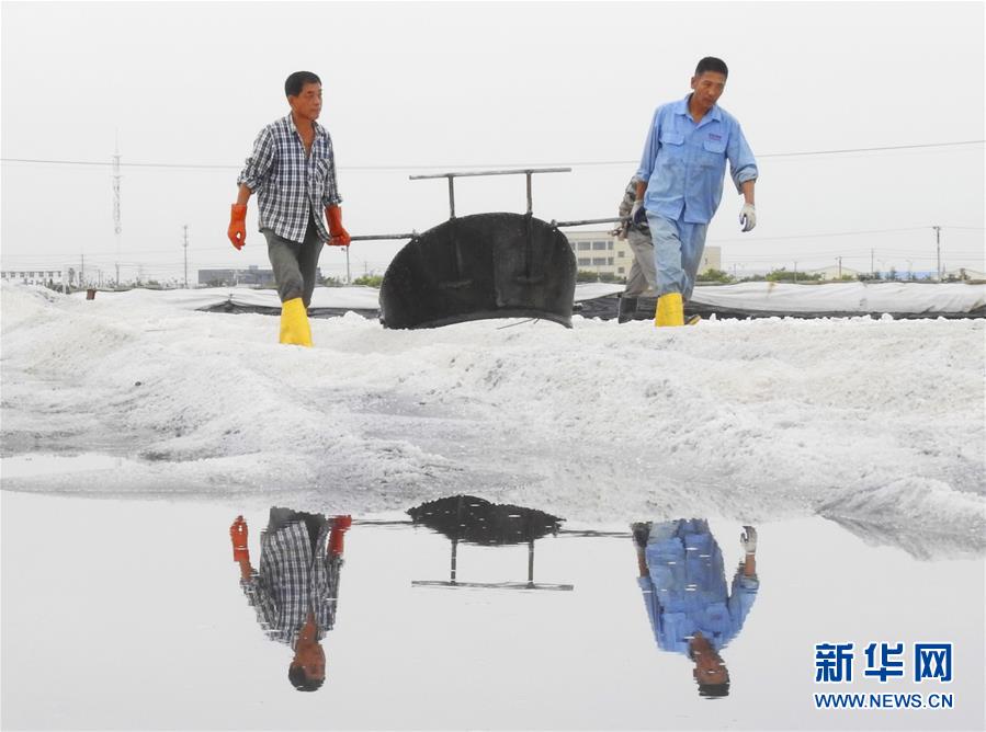 近日,江苏连云港数十万亩盐田全面进入秋季扒盐作业阶段。工人们忙碌着收获原盐,盐田中一派繁忙景象。