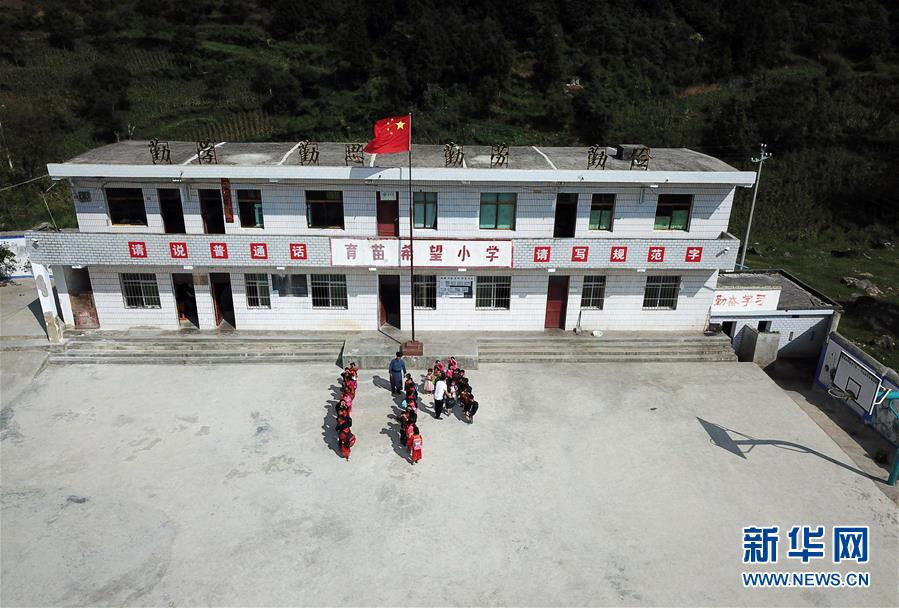 9月5日,杨朝俊将放学的学生集合在一起,交代放学路上的安全注意事项(无人机航拍)。 杨朝俊在贵州毕节市花溪彝族苗族乡教书34个年头,换了5所小学。花溪彝族苗族乡海拔高,交通闭塞,很多外地老师来后总也留不住,只要哪所学校缺老师,杨朝俊就补上。2013年,丰坪小学的老教师到期退休,学校陷入无老师接班的困境。当地教育管理部门准备将学校并入3公里外的中心完小,但这样一来,村里的学生每天要多走一个多小时山路去上学。杨朝俊知道后,主动申请调入丰坪小学,解决了学校老师“断代”和村里孩子上学远的难题。 从2013年至2017年,杨朝俊孤身一人守着丰坪小学两个年级的30余名学生,从保健卫生、课间活动,到写字念书,吃饭和上下学,杨老师无微不至地照顾和教导学生,他默默坚守的事迹吸引了一名支教老师前来“搭班”。今年新学期开学时,当地教育部门又选派了一名年轻的特岗教师来到学校,与他分担幼儿班和一二年级的教学工作。 现在杨朝俊最担心的是退休后能否有老师来“接班”,他期盼能有更多人来到这里,让偏远乡村小学的教学“薪火”继续传递下去。 新华社发(杨文斌摄)