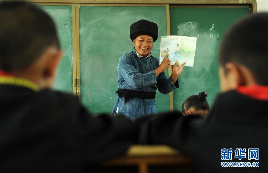 9月5日,杨朝俊给学生上语文课。 杨朝俊在贵州毕节市花溪彝族苗族乡教书34个年头,换了5所小学。花溪彝族苗族乡海拔高,交通闭塞,很多外地老师来后总也留不住,只要哪所学校缺老师,杨朝俊就补上。2013年,丰坪小学的老教师到期退休,学校陷入无老师接班的困境。当地教育管理部门准备将学校并入3公里外的中心完小,但这样一来,村里的学生每天要多走一个多小时山路去上学。杨朝俊知道后,主动申请调入丰坪小学,解决了学校老师“断代”和村里孩子上学远的难题。 从2013年至2017年,杨朝俊孤身一人守着丰坪小学两个年级的30余名学生,从保健卫生、课间活动,到写字念书,吃饭和上下学,杨老师无微不至地照顾和教导学生,他默默坚守的事迹吸引了一名支教老师前来“搭班”。今年新学期开学时,当地教育部门又选派了一名年轻的特岗教师来到学校,与他分担幼儿班和一二年级的教学工作。 现在杨朝俊最担心的是退休后能否有老师来“接班”,他期盼能有更多人来到这里,让偏远乡村小学的教学“薪火”继续传递下去。 新华社发(杨文斌摄)