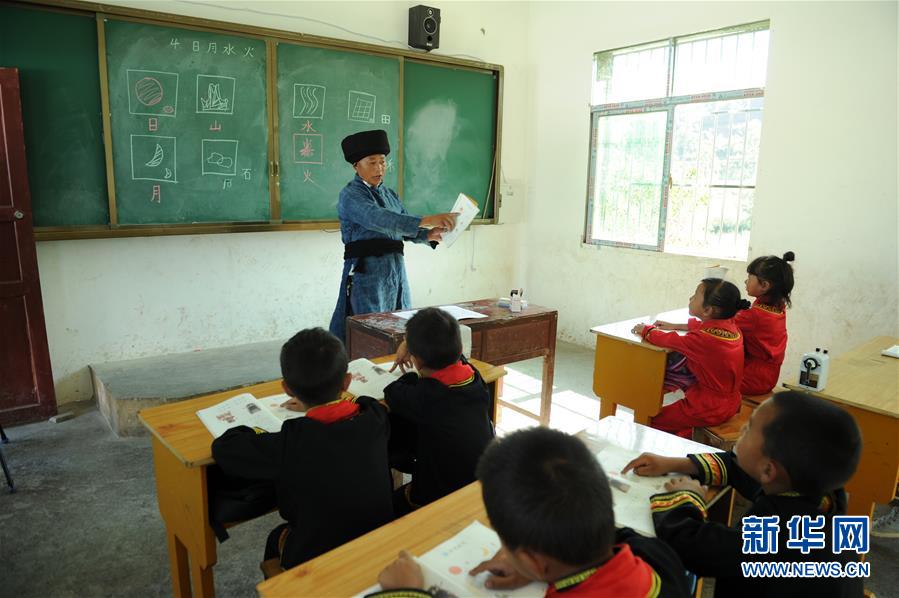 9月5日,杨朝俊给学生上语文课。 杨朝俊在贵州毕节市花溪彝族苗族乡教书34个年头,换了5所小学。花溪彝族苗族乡海拔高,交通闭塞,很多外地老师来后总也留不住,只要哪所学校缺老师,杨朝俊就补上。2013年,丰坪小学的老教师到期退休,学校陷入无老师接班的困境。当地教育管理部门准备将学校并入3公里外的中心完小,但这样一来,村里的学生每天要多走一个多小时山路去上学。杨朝俊知道后,主动申请调入丰坪小学,解决了学校老师“断代”和村里孩子上学远的难题。 从2013年至2017年,杨朝俊孤身一人守着丰坪小学两个年级的30余名学生,从保健卫生、课间活动,到写字念书,吃饭和上下学,杨老师无微不至地照顾和教导学生,他默默坚守的事迹吸引了一名支教老师前来“搭班”。今年新学期开学时,当地教育部门又选派了一名年轻的特岗教师来到学校,与他分担幼儿班和一二年级的教学工作。 现在杨朝俊最担心的是退休后能否有老师来“接班”,他期盼能有更多人来到这里,让偏远乡村小学的教学“薪火”继续传递下去。 新华社发(杨文斌摄)