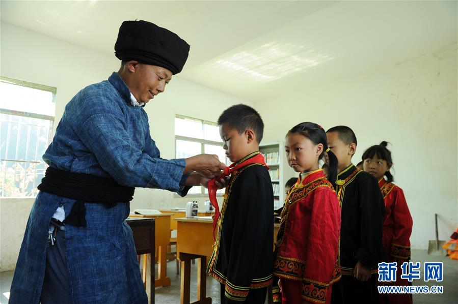 9月5日,杨朝俊帮助新入学的一年级学生系红领巾。 杨朝俊在贵州毕节市花溪彝族苗族乡教书34个年头,换了5所小学。花溪彝族苗族乡海拔高,交通闭塞,很多外地老师来后总也留不住,只要哪所学校缺老师,杨朝俊就补上。2013年,丰坪小学的老教师到期退休,学校陷入无老师接班的困境。当地教育管理部门准备将学校并入3公里外的中心完小,但这样一来,村里的学生每天要多走一个多小时山路去上学。杨朝俊知道后,主动申请调入丰坪小学,解决了学校老师“断代”和村里孩子上学远的难题。 从2013年至2017年,杨朝俊孤身一人守着丰坪小学两个年级的30余名学生,从保健卫生、课间活动,到写字念书,吃饭和上下学,杨老师无微不至地照顾和教导学生,他默默坚守的事迹吸引了一名支教老师前来“搭班”。今年新学期开学时,当地教育部门又选派了一名年轻的特岗教师来到学校,与他分担幼儿班和一二年级的教学工作。 现在杨朝俊最担心的是退休后能否有老师来“接班”,他期盼能有更多人来到这里,让偏远乡村小学的教学“薪火”继续传递下去。 新华社发(杨文斌摄)