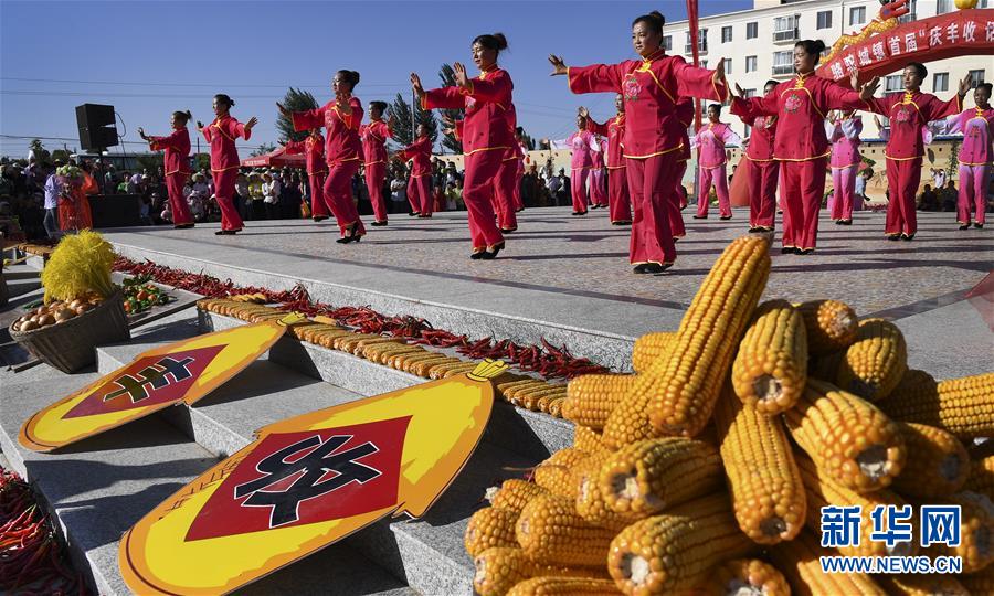 9月6日,高台县骆驼城镇群众在丰收节上载歌载舞。 当日,甘肃省张掖市高台县在骆驼城镇举办“丰收节”,丰富多彩的各类农事比赛、趣味文体活动,让乡亲们感受丰收的欢乐。 新华社记者 陶明 摄