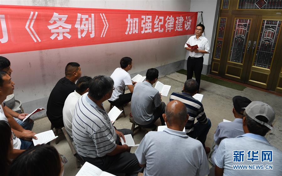 9月6日,在江苏省泗阳县张家圩镇小史集村农家小院,纪检干部组织当地党员学习新修订的《中国共产党纪律处分条例》。