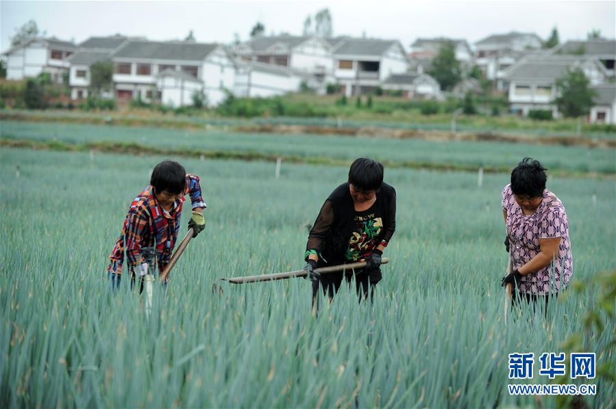 9月6日,农民在贵州省黔西县林泉镇海子村蔬菜种植基地里管护香葱。 新华社发(杨文斌 摄)