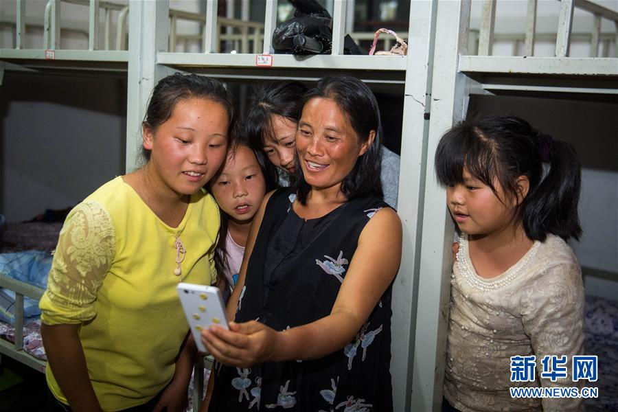 在麻栗坡县猛硐瑶族乡猛硐中学安置点,王廷芬(中)和在文山壮族苗族自治州上学的女儿用手机进行视频聊天(9月4日摄)。