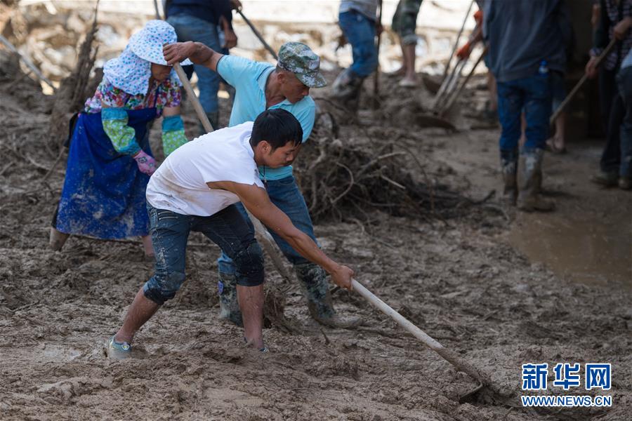 在麻栗坡县猛硐瑶族乡,当地群众在清理房屋边的淤泥(9月5日摄)。