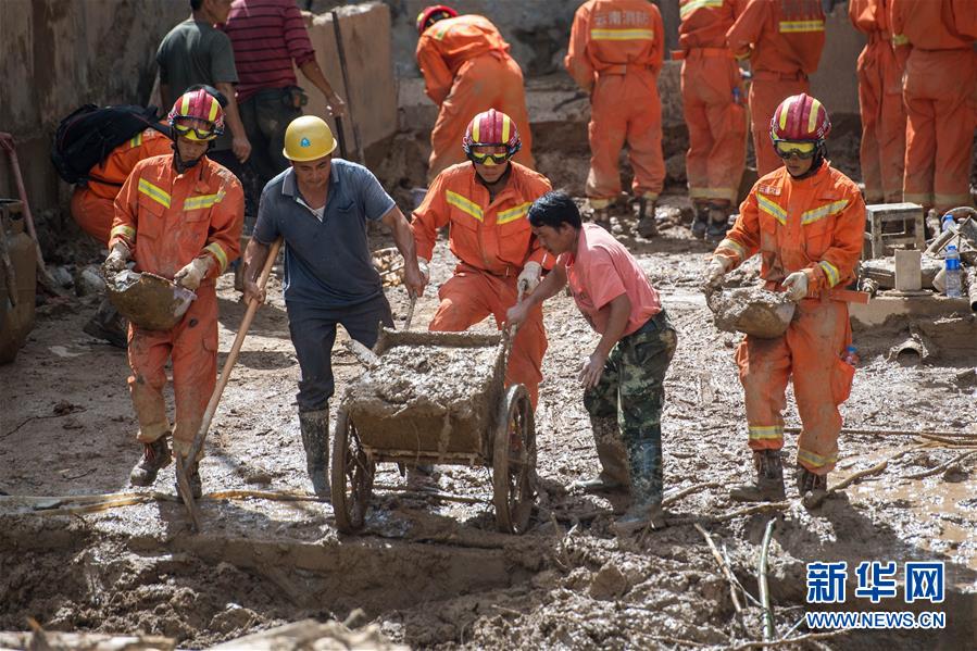 在麻栗坡县猛硐瑶族乡,消防官兵和当地群众在清理淤泥(9月5日摄)。