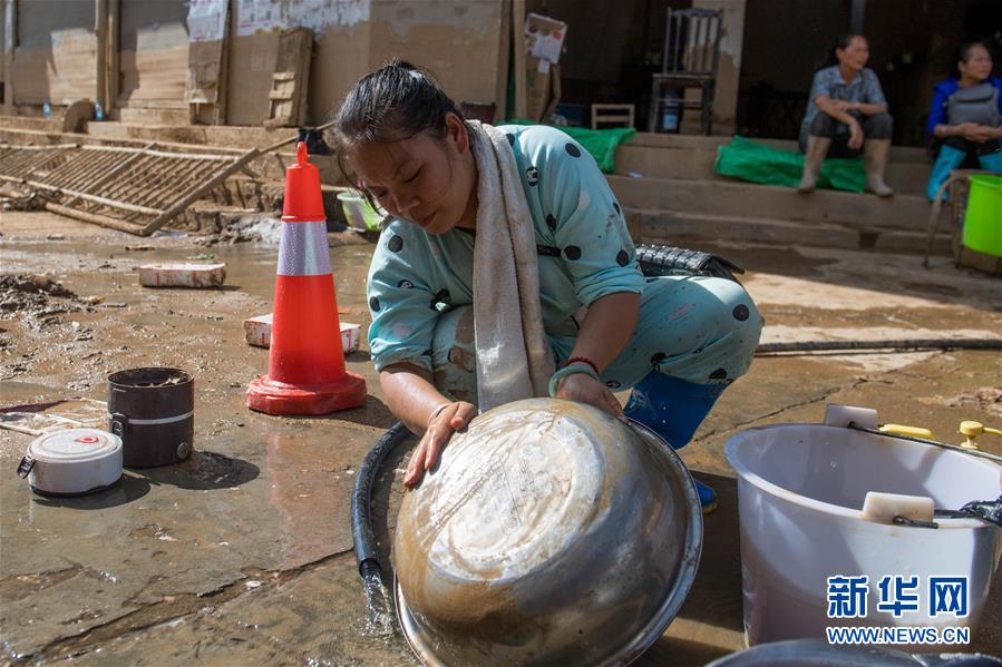 在麻栗坡县猛硐瑶族乡,受灾群众在清洗生活用品(9月5日摄)。