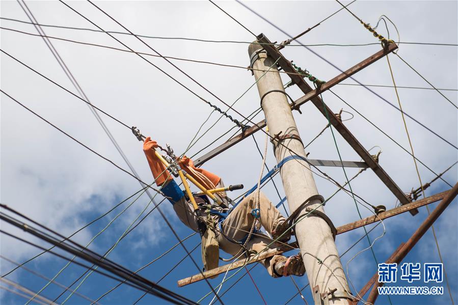在麻栗坡县猛硐瑶族乡,麻栗坡县供电局的工作人员抢修受损电力设备(9月5日摄)。