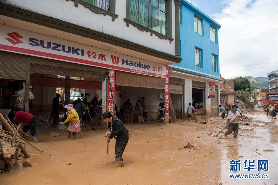 在麻栗坡县猛硐瑶族乡,当地群众在清理道路淤泥(9月3日摄)。