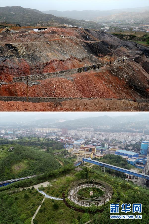 拼版照片:上图为在山西省灵石县两渡镇,山西焦煤汾西矿业两渡煤业公司矸石山治理前的景象(资料照片);下图为无人机拍摄的山西焦煤汾西矿业两渡煤业公司矸石山治理后的景象(9月4日新华社记者詹彦摄)。 组建于2001年的山西焦煤集团是一家大型煤炭企业,在长期煤炭开采过程中产生大量的煤矸石,在矿区附近形成了一座座巨大的矸石山,严重影响和污染着矿区环境。 为解决矸石山造成的环境污染问题,近年来,山西焦煤集团对矸石山开展大规模的治理与生态恢复工作,采取分层碾压、设拦矸坝、黄土覆盖、绿化等措施治理矸石山。经过不断的探索和实践,如今,山西焦煤集团矸石山治理已见成效,昔日污染严重的矸石山面貌焕然一新,占地面积约7078亩的矸石山披上了“绿色外衣”,成为矿区的“绿色名片”。 新华社发