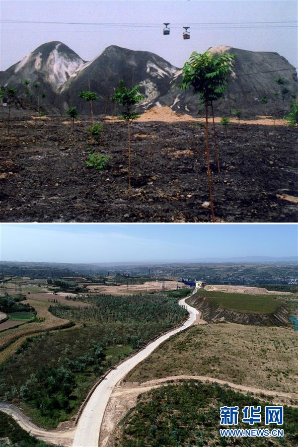 拼版照片:上图为在山西省霍州市辛置镇,山西焦煤霍州煤电辛置煤矿矸石山治理前的景象(资料照片);下图为无人机拍摄的山西焦煤霍州煤电辛置煤矿矸石山治理后的景象(9月6日新华社记者詹彦摄)。 组建于2001年的山西焦煤集团是一家大型煤炭企业,在长期煤炭开采过程中产生大量的煤矸石,在矿区附近形成了一座座巨大的矸石山,严重影响和污染着矿区环境。 为解决矸石山造成的环境污染问题,近年来,山西焦煤集团对矸石山开展大规模的治理与生态恢复工作,采取分层碾压、设拦矸坝、黄土覆盖、绿化等措施治理矸石山。经过不断的探索和实践,如今,山西焦煤集团矸石山治理已见成效,昔日污染严重的矸石山面貌焕然一新,占地面积约7078亩的矸石山披上了“绿色外衣”,成为矿区的“绿色名片”。 新华社发