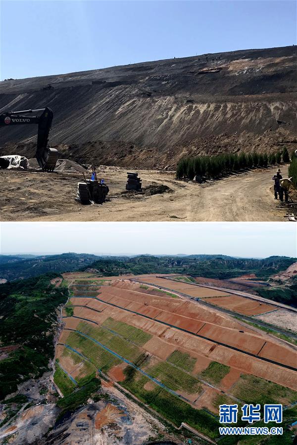 拼版照片:上图为在山西省孝义市阳泉曲镇,山西焦煤汾西矿业柳湾煤矿矸石山治理前的景象(资料照片);下图为无人机拍摄的山西焦煤汾西矿业柳湾煤矿正在进行综合治理的矸石山(9月5日新华社记者詹彦摄)。 组建于2001年的山西焦煤集团是一家大型煤炭企业,在长期煤炭开采过程中产生大量的煤矸石,在矿区附近形成了一座座巨大的矸石山,严重影响和污染着矿区环境。 为解决矸石山造成的环境污染问题,近年来,山西焦煤集团对矸石山开展大规模的治理与生态恢复工作,采取分层碾压、设拦矸坝、黄土覆盖、绿化等措施治理矸石山。经过不断的探索和实践,如今,山西焦煤集团矸石山治理已见成效,昔日污染严重的矸石山面貌焕然一新,占地面积约7078亩的矸石山披上了“绿色外衣”,成为矿区的“绿色名片”。 新华社发