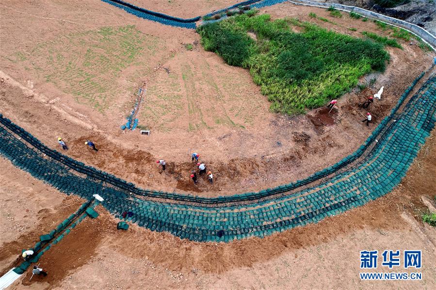在山西省孝义市阳泉曲镇的山西焦煤汾西矿业柳湾煤矿,工作人员在矸石山综合治理工程现场施工(9月5日无人机拍摄)。 组建于2001年的山西焦煤集团是一家大型煤炭企业,在长期煤炭开采过程中产生大量的煤矸石,在矿区附近形成了一座座巨大的矸石山,严重影响和污染着矿区环境。 为解决矸石山造成的环境污染问题,近年来,山西焦煤集团对矸石山开展大规模的治理与生态恢复工作,采取分层碾压、设拦矸坝、黄土覆盖、绿化等措施治理矸石山。经过不断的探索和实践,如今,山西焦煤集团矸石山治理已见成效,昔日污染严重的矸石山面貌焕然一新,占地面积约7078亩的矸石山披上了“绿色外衣”,成为矿区的“绿色名片”。 新华社记者 詹彦 摄
