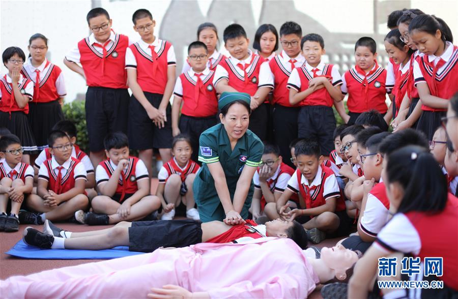 9月7日,衡水市第五人民医院急诊科医护人员向康复街小学学生传授心肺复苏急救技能。 当日,河北省衡水市康复街小学联合衡水市第五人民医院开展“急救知识进校园”主题活动。医护人员现场向学生传授心肺复苏、包扎等急救技能,提升孩子们的应急救护意识和能力,迎接“世界急救日”的到来。 新华社记者 朱旭东 摄