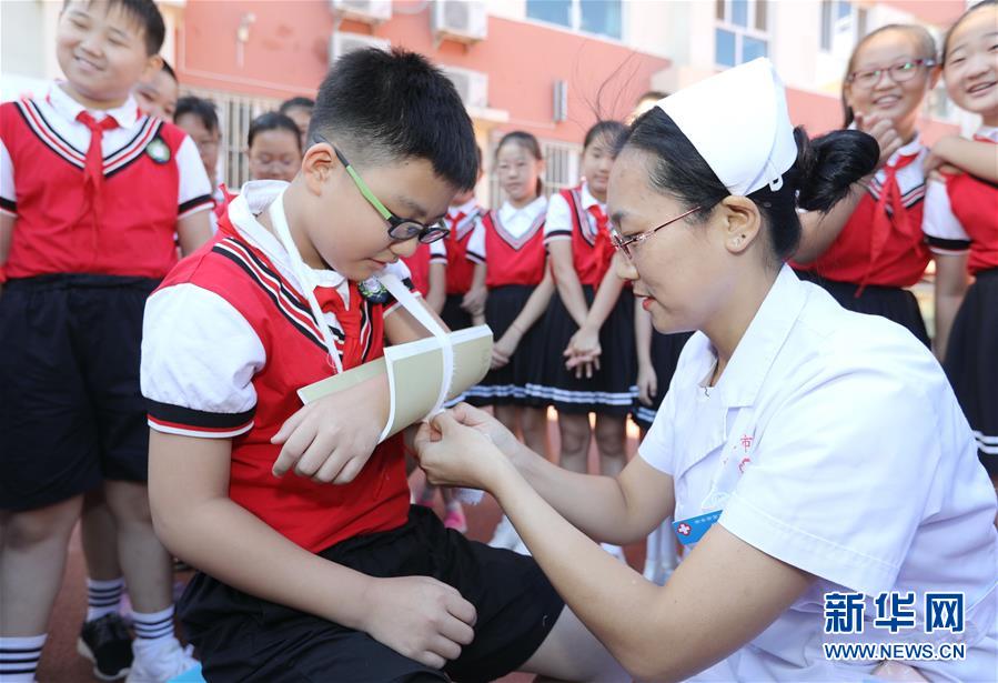 9月7日,衡水市第五人民医院急诊科医护人员向康复街小学学生演示骨折急救技能。 当日,河北省衡水市康复街小学联合衡水市第五人民医院开展“急救知识进校园”主题活动。医护人员现场向学生传授心肺复苏、包扎等急救技能,提升孩子们的应急救护意识和能力,迎接“世界急救日”的到来。 新华社记者 朱旭东 摄